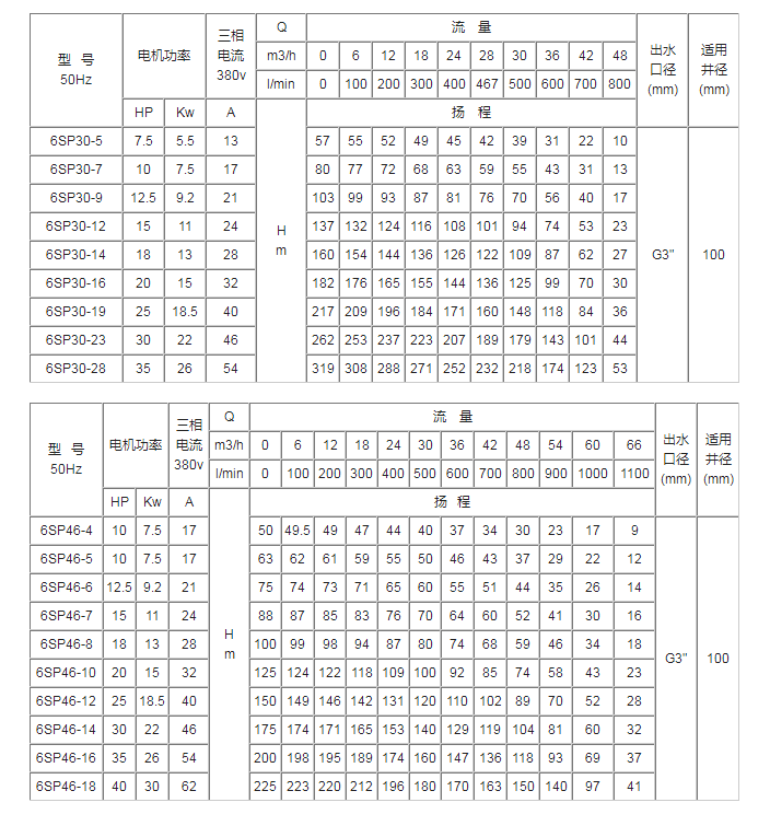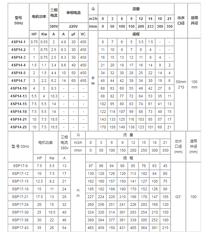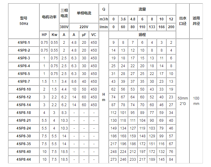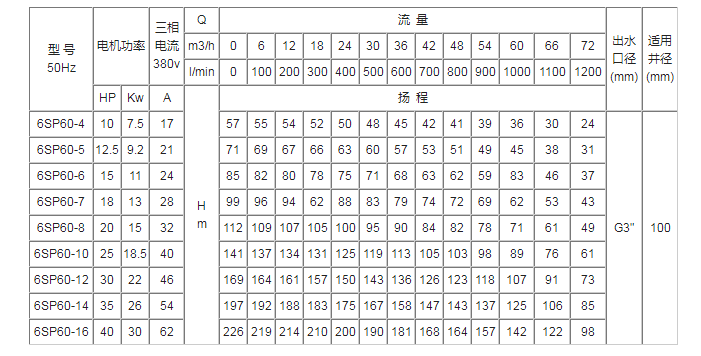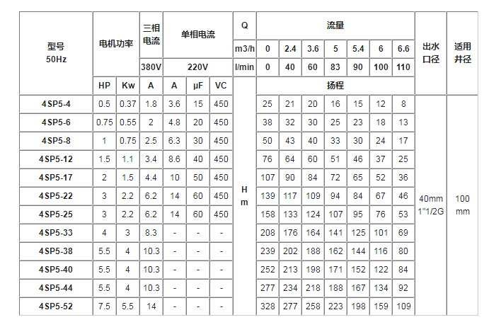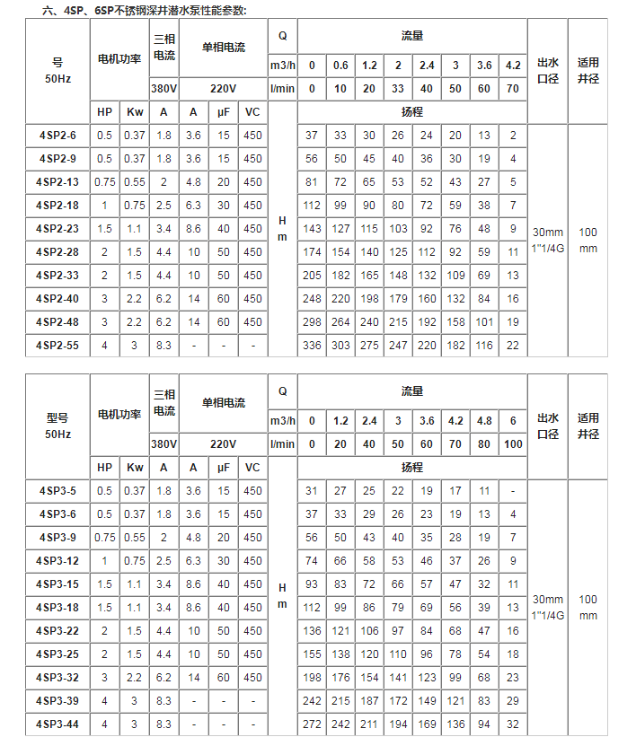 六、4SP、6SP不銹鋼深井潛水泵性能參數(shù):