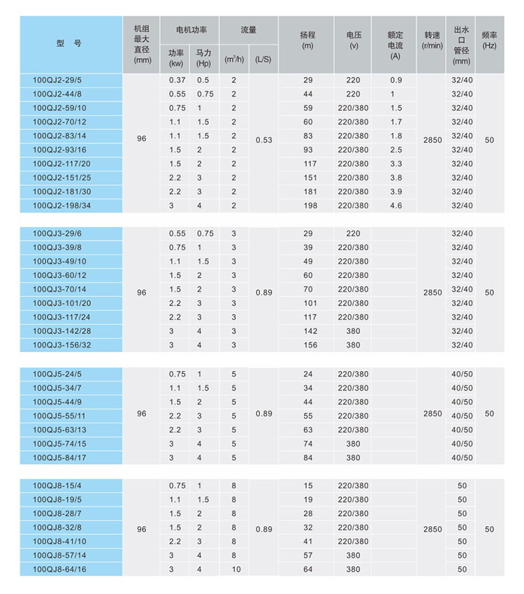 100QJ井用潛水泵產(chǎn)品選型: