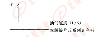 例如:2X-8 2 - 代表雙級 X - 代表旋片式真空泵 8 - 每秒鐘抽氣速率為8