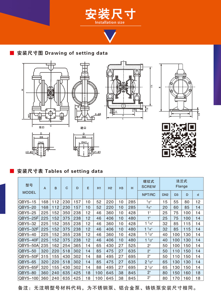 正奧公司生產(chǎn)的隔膜泵共有十二種規(guī)格。進出口尺寸分別為1/4”(10mm)、1/2”(15mm)、3/4”(20mm)、1”(25mm)、1.2”(32mm)1.5”(40mm)、2”(50mm)、2.5”(65mm)3”(80mm)、4”(100mm)流體部件材質(zhì)有:鋁合金、鑄鐵、聚丙烯、不銹鋼、隔膜根據(jù)不同膜片材質(zhì)分別有:丁晴橡膠、氯丁橡膠、聚乙烯、聚膠、聚醚橡膠、氟橡膠、氟塑料、特氟隆。以滿足不同液體介質(zhì)的需要。