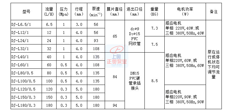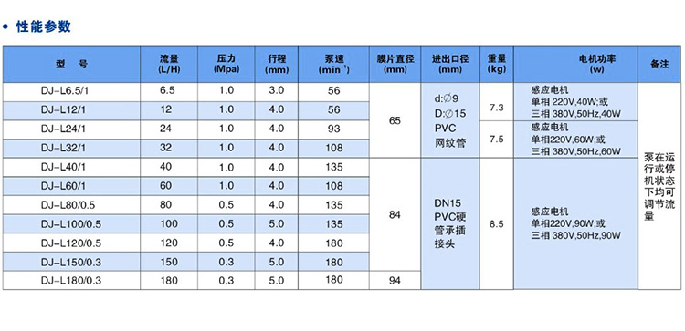 三、DJ-L型隔膜式計(jì)量泵技術(shù)參數(shù):