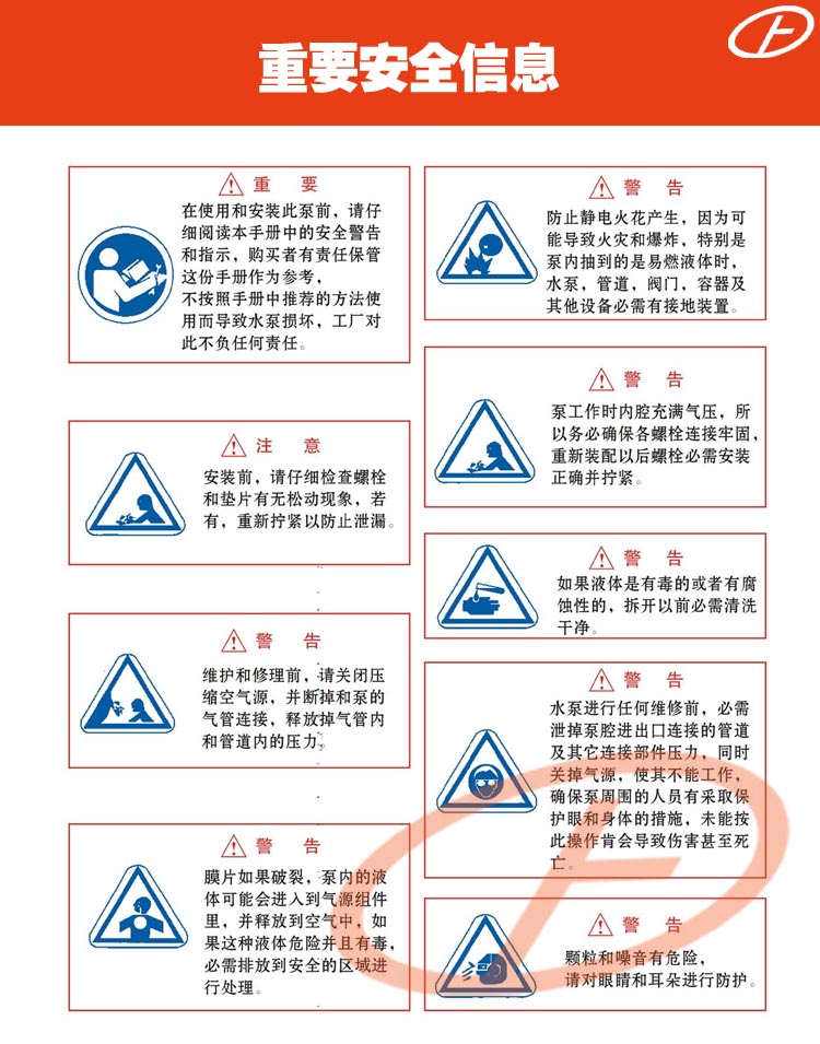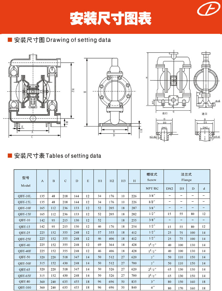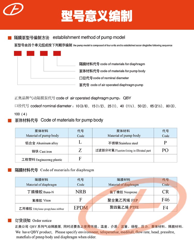 正奧公司目前已形成系列化生產(chǎn),共有八種規(guī)格直徑:φ10mm(3/8')、φ15mm(1/2')、φ25mm(1')、φ40mm(11/2')、φ50mm(2')、φ65mm(21/2')、φ80mm(3')、φ100mm(4')。五種材質(zhì):鋁合金、鑄鐵、不銹鋼、工程塑料、襯里(襯膠隔膜泵,襯氟隔膜泵)。隔膜泵根據(jù)不同液體介質(zhì)分別采用丁晴橡膠、氯丁橡膠、氟橡膠、聚四氟乙烯隔膜。以滿足不同用戶的需要。