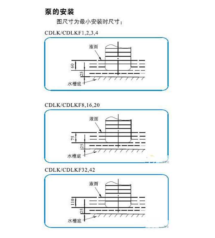 CDLK/CDLKF為安裝標(biāo)準(zhǔn)電機(jī)的自吸立式多級(jí)離心液下泵,電機(jī)軸通過泵頭用聯(lián)軸器直接與泵軸聯(lián)接,泵可根據(jù)需要配置智能保護(hù)器,對(duì)泵干轉(zhuǎn)、缺相、過載等進(jìn)行有效保護(hù)。為滿足水槽或容器的安裝深度,可安裝空腔體來改變泵本身的長度,不同的級(jí)數(shù)長度見尺寸和重量表和可供產(chǎn)品范圍表。